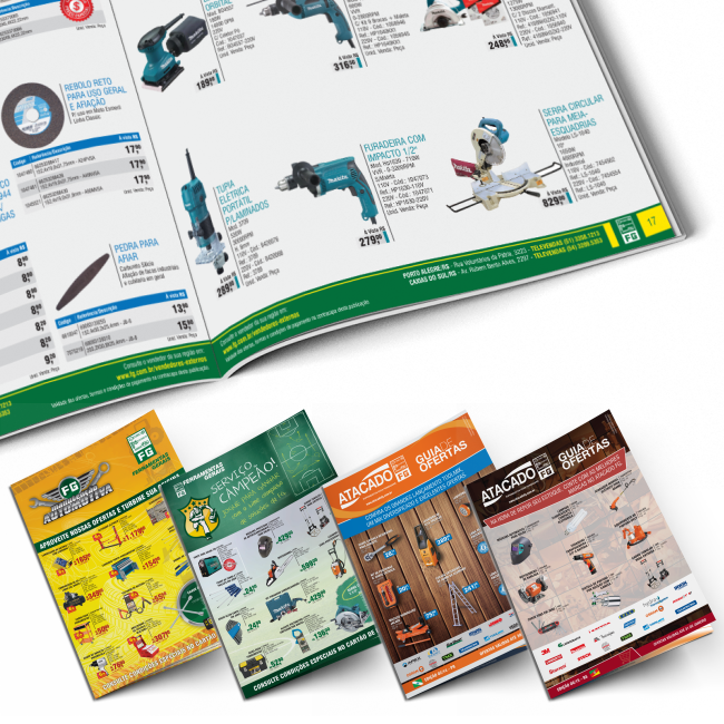 Ferramentas Gerais: Tabloides de ofertas com 250 skus em 5 edições mensais, totalizando aproximadamente 100 páginas/mês.